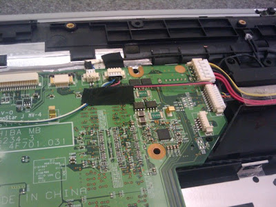 Step 19 : Here on the top right part, we see the connectors for the power and right hand USB ports, which are on their own separate circuit board. Go ahead and remove these cables. Be careful of the power cable; it’s held down pretty tightly but its plastic is flimsy. The cable on the top is actually connected to the speakers which are located on the top left as well as the top right.